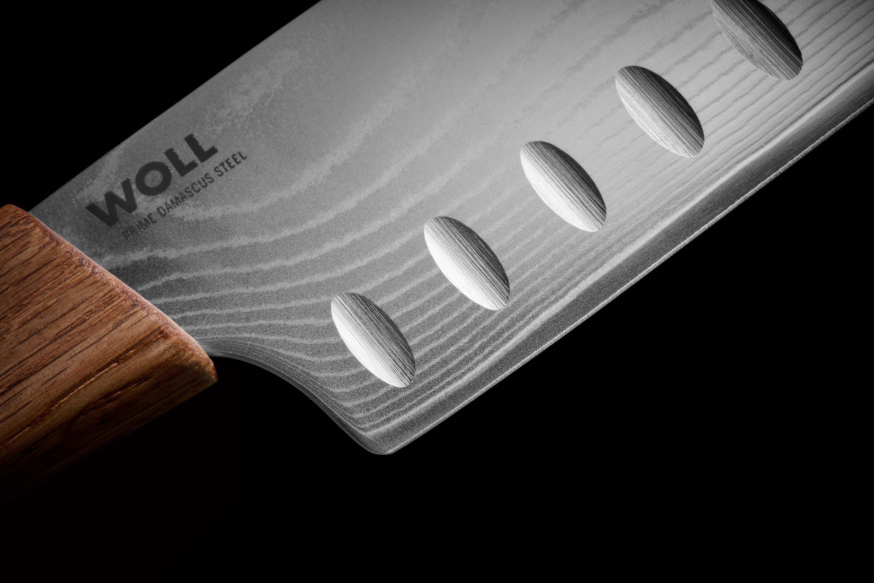 Das besondere Griffdesign trägt nicht nur zur optimalen Ergonomie bei, sondern verleiht dem Messer auch eine hochwertige, edle Optik. Das gebürstete Eichenholz harmoniert perfekt mit der eleganten Klinge und macht dieses Santokumesser zu einem echten Blickfang in jeder Küche.